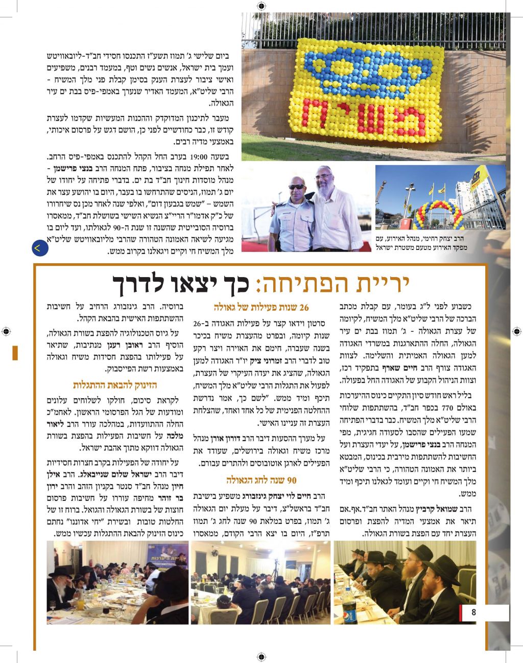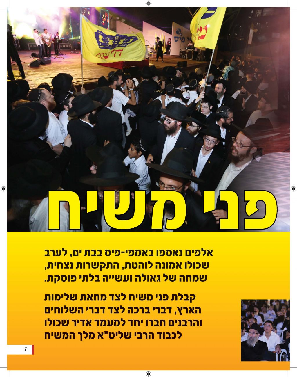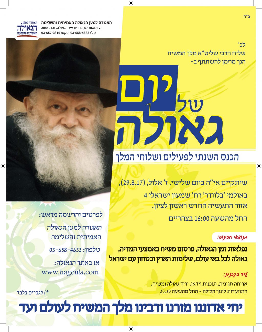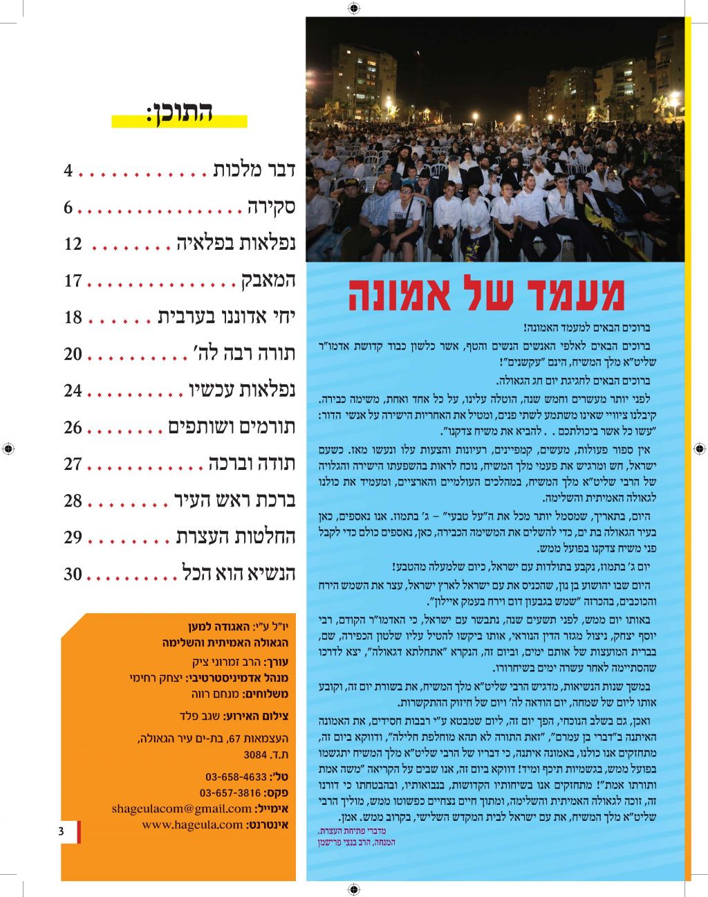 מגזין מושקע זה יוצא לאור כהמשך להוראותו של כ"ק אדמו"ר מלך המשיח שליט"א למארגני האירועים בחסידות, להוציא לאור את דברי הרבנים והאורחים המכובדים. אין ספק כי תוכנה העשיר של החוברת, ימשיך לחולל את מהפיכת הגאולה המתחוללת בעולם כולו וכפי שבאה לידי ביטוי בעצרת הענק.