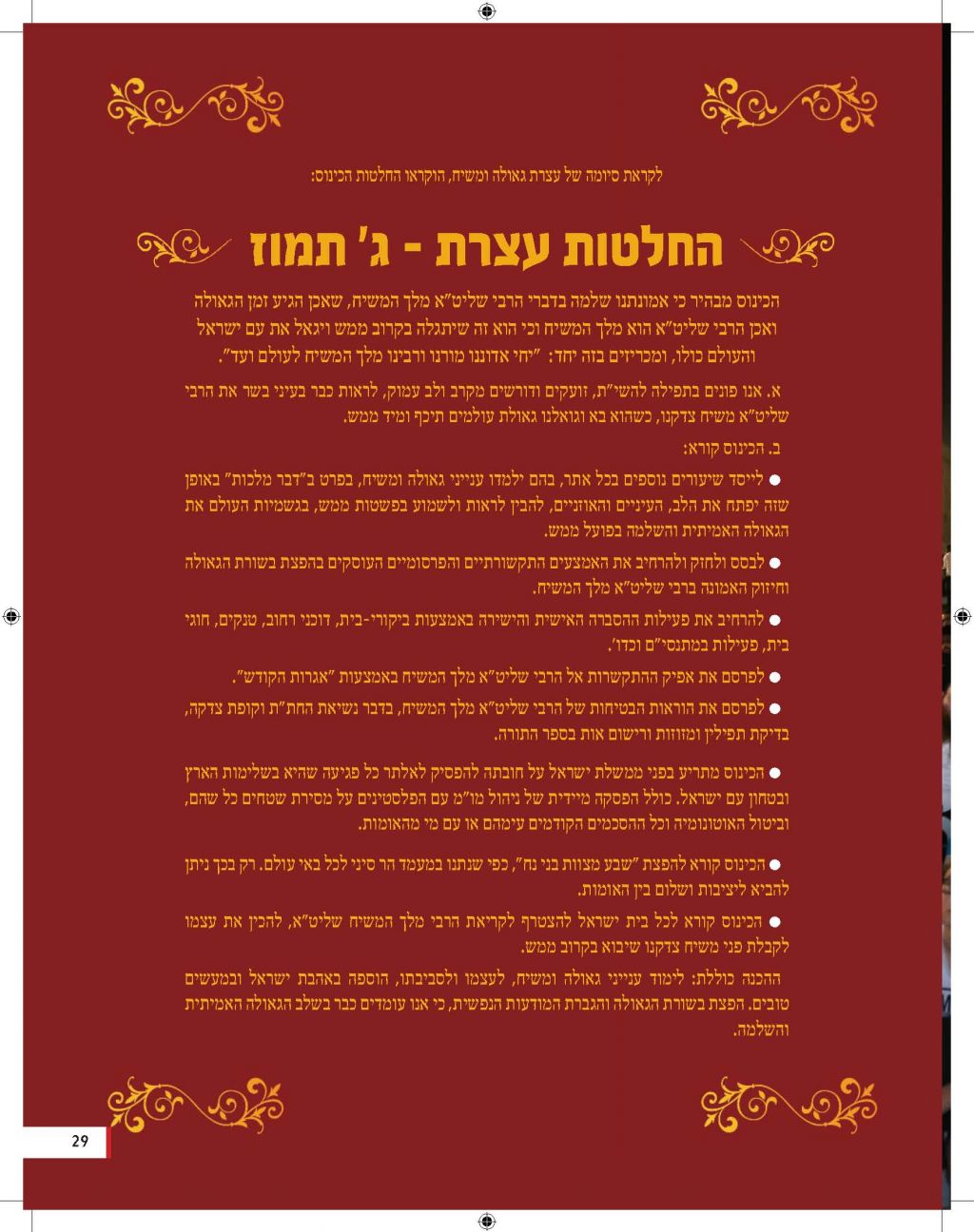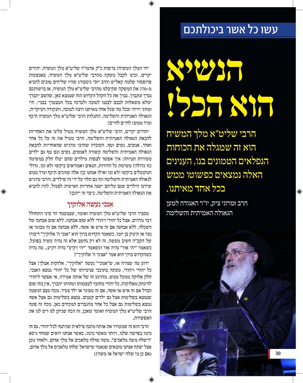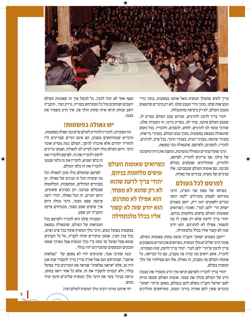 מגזין מושקע זה יוצא לאור כהמשך להוראותו של כ"ק אדמו"ר מלך המשיח שליט"א למארגני האירועים בחסידות, להוציא לאור את דברי הרבנים והאורחים המכובדים. אין ספק כי תוכנה העשיר של החוברת, ימשיך לחולל את מהפיכת הגאולה המתחוללת בעולם כולו וכפי שבאה לידי ביטוי בעצרת הענק.