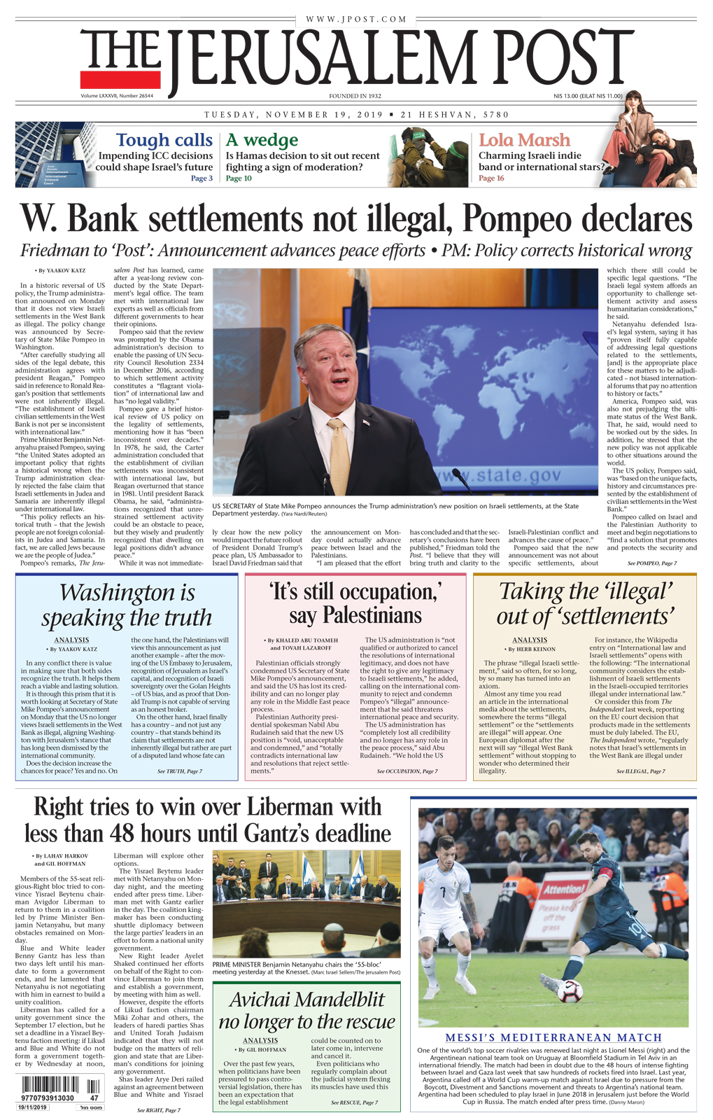 מייק פומפיאו שר החוץ האמריקני בהודעה הדרמטית לתקשורת: ההתנחלויות אינן נוגדות את החוק הבינ"ל ואינן מהוות מכשול לשלום. בהמשך הודעתו מפרט מייק פומפיאו את יחס משרד החוץ האמריקני להתנחלויות בעשרות השנים האחרונות, ואומר: משרד החוץ האמריני בחן מחדש את הסוגיה המשפטית, והגיע להחלטה שההתנחלויות אינן נוגדות את החוק הבינלאומי, ולא מהוות מכשול לשלום.