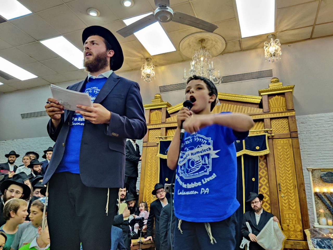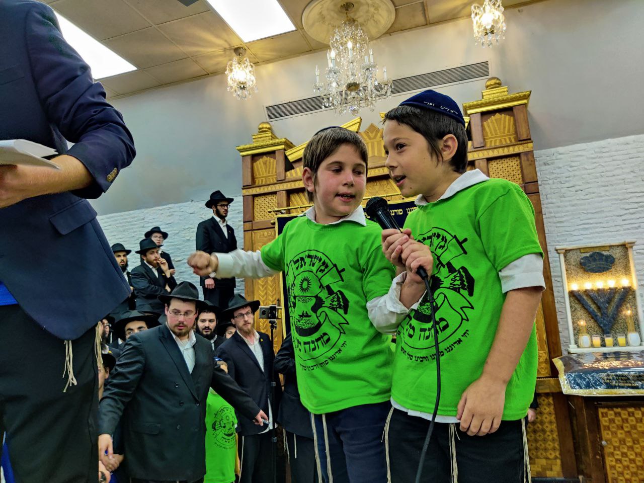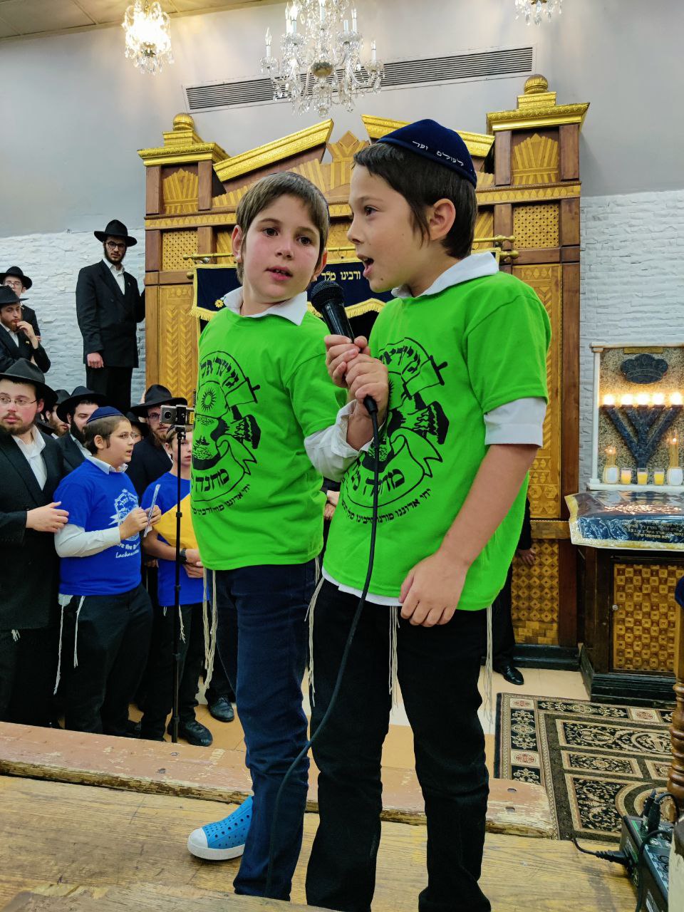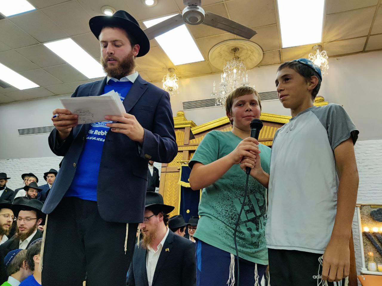 הילדים פצחו בשירים אותם למדו ב'קעמפ', וכעבור כמה דקות נעמדו כולם הכן לקראת כניסתו של הרבי שליט"א מלך המשיח לתפילת מנחה.