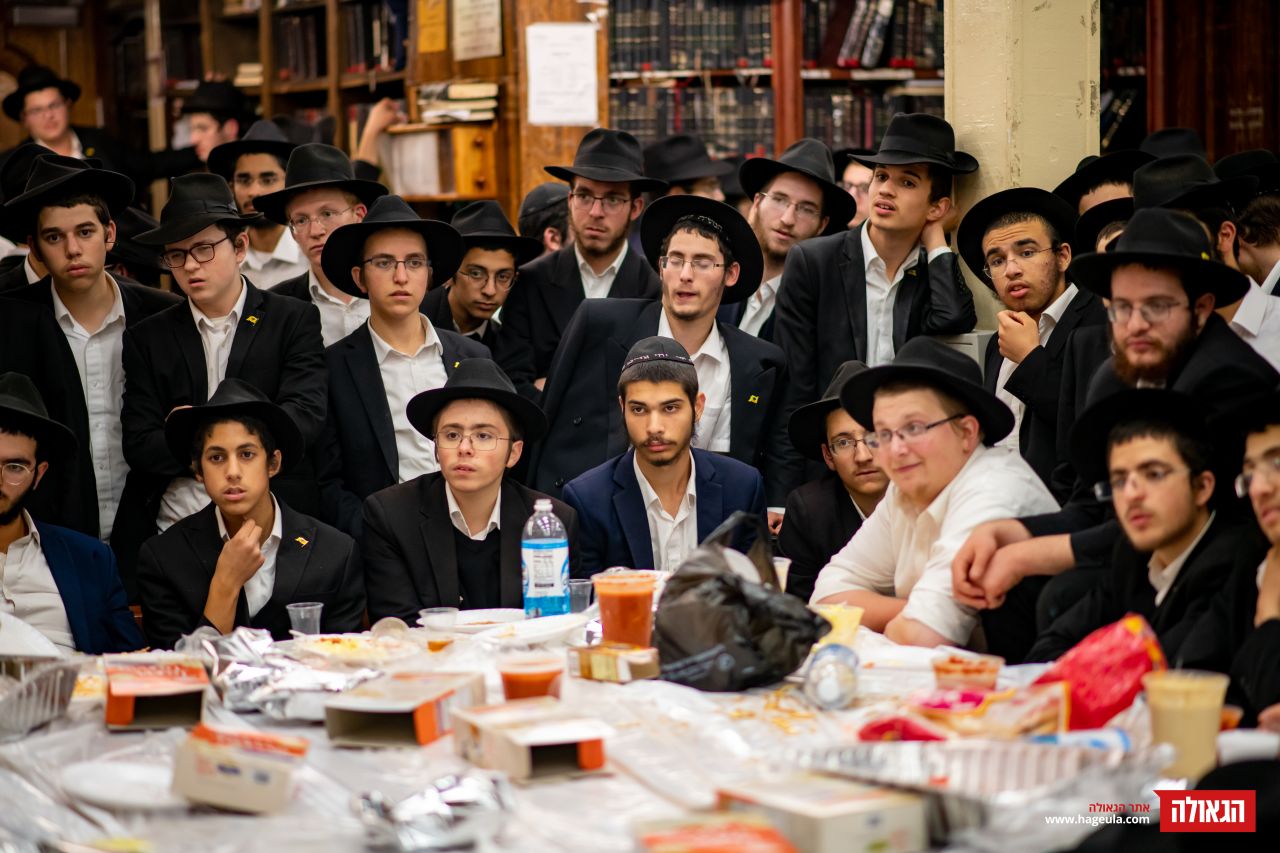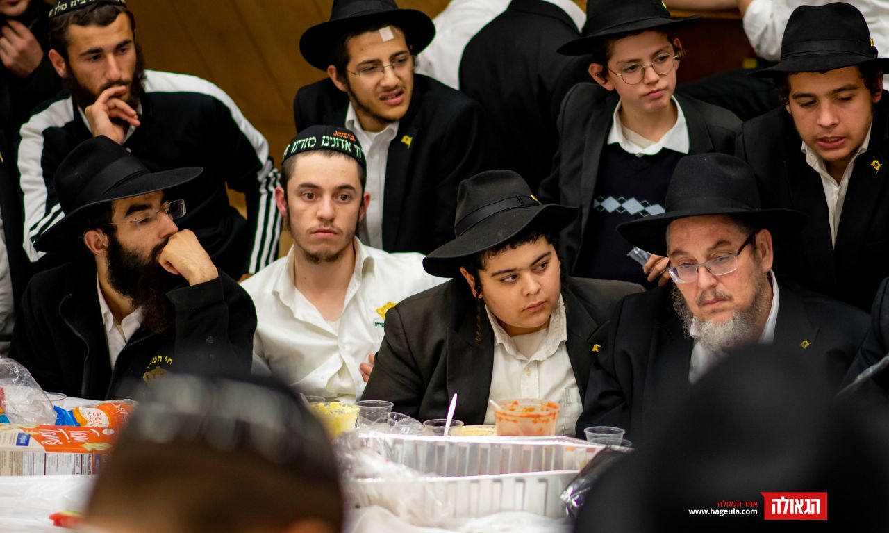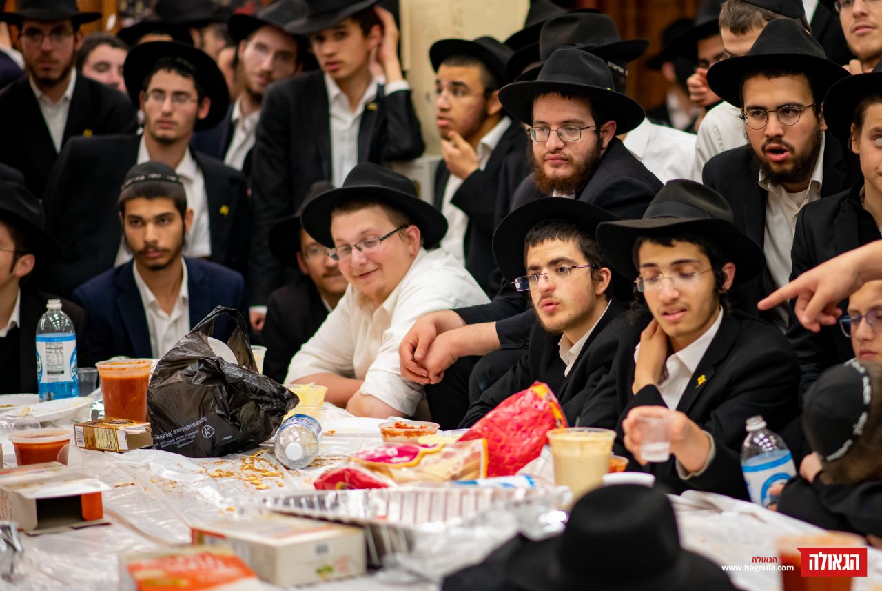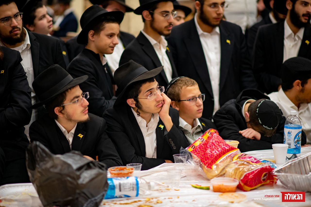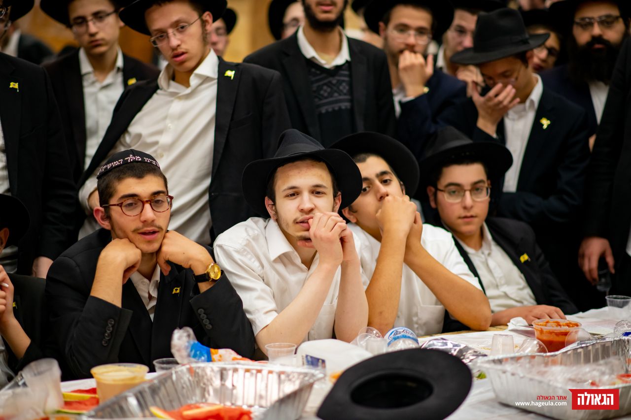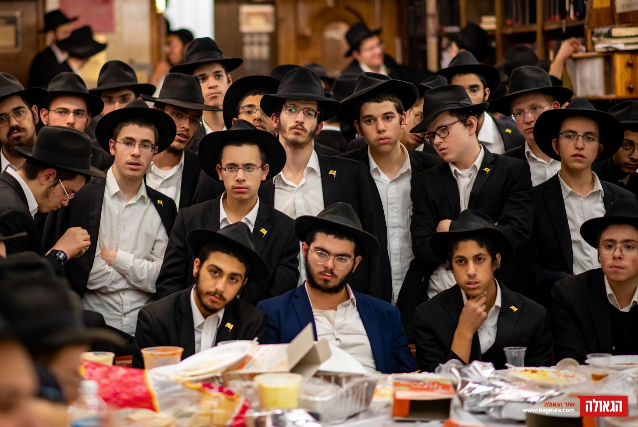 כ-200 בחורים ישבו סביב השולחן והספסלים הסמוכים והאזינו לרבנים בקשב.