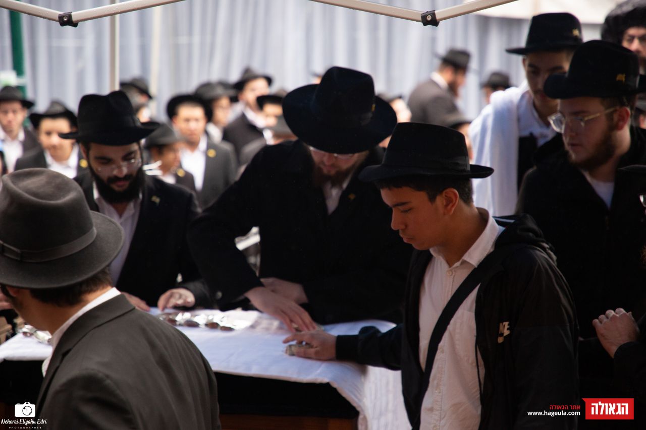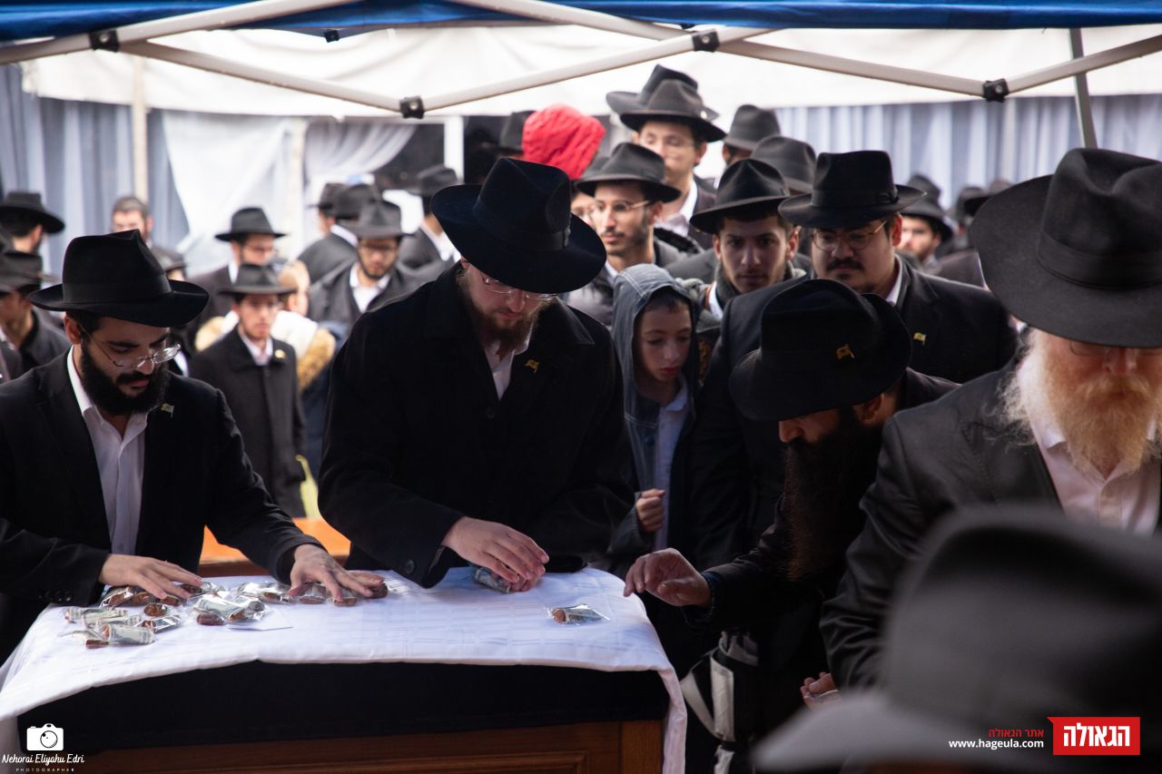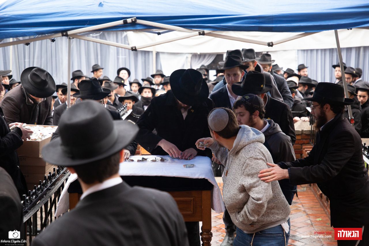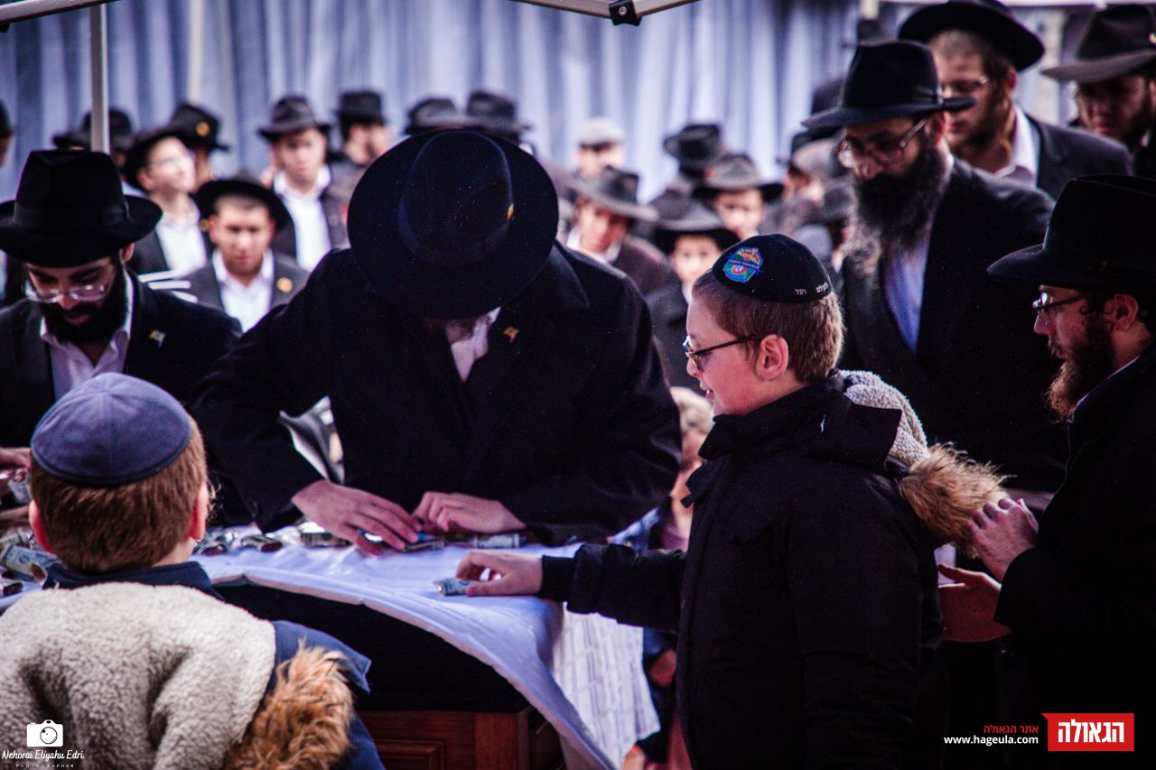 לאחר כעשרים דקות החל הרבי מלך המשיח שליט"א לחלק לקהל האלפים פרוסת 'לעקאח' - עוגת דבש בצירוף שטר של דולר, כפי מנהג חב"ד. לאחר תור הגברים, עברו גם מאות נשים לקבל 'לעקאח'.