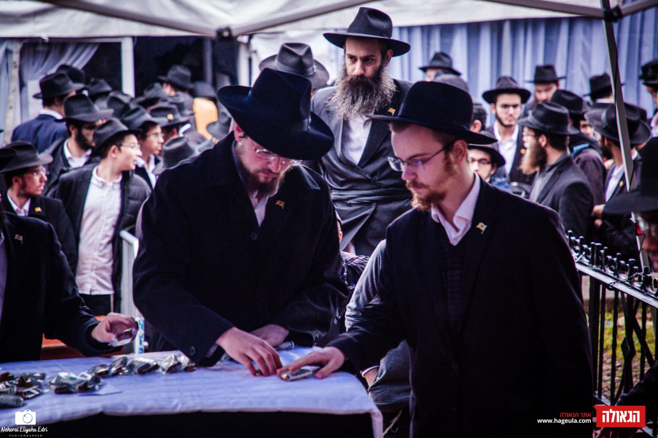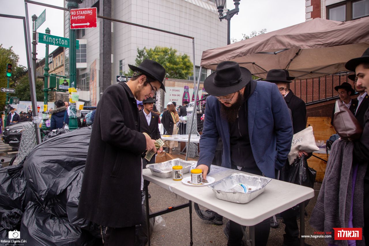 לאחר סיום התפילה החל הקהל לצאת החוצה, שם עמדו דוכנים רבים למתן צדקה עבור מוסדות חינוך והפצת משיח. כולם משלשלים מטבע או שטר לקופות הצדקה.