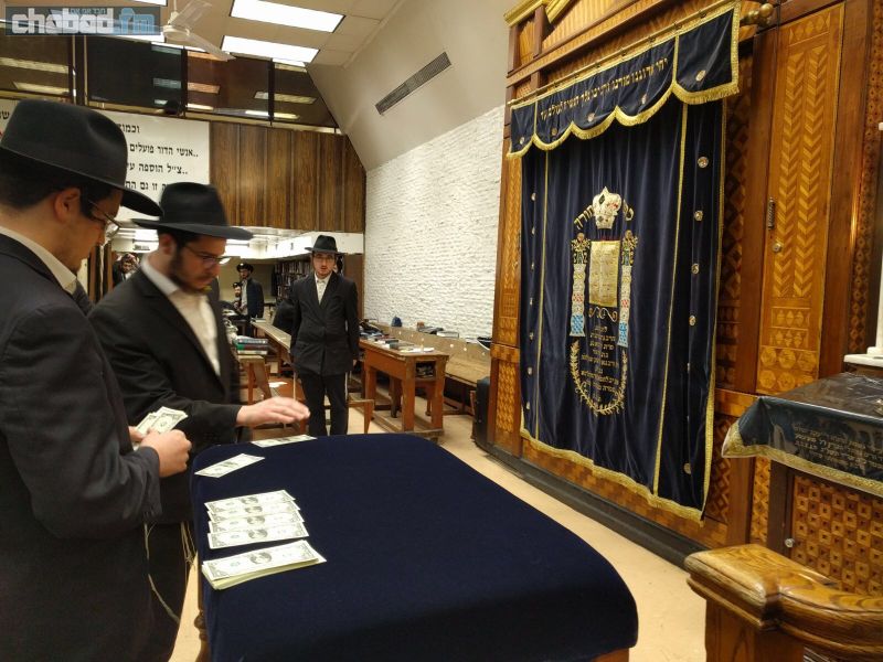 כמנהג ישראל מקדמא דנן, נעמדו מאות מאנ"ש ותלמידי התמימים לקיים את מנהג "מחצית השקל" לפני תפילת מנחה בבית משיח 770 על המטבעות שבהם השתמש כ"ק אדמו"ר מלך המשיח שליט"א. הגבאים העמידו את המטבעות ליד בימת הקריאה והקהל הגדול פדה אותם ונתנו את התמורה תרומה לבית משיח 770.