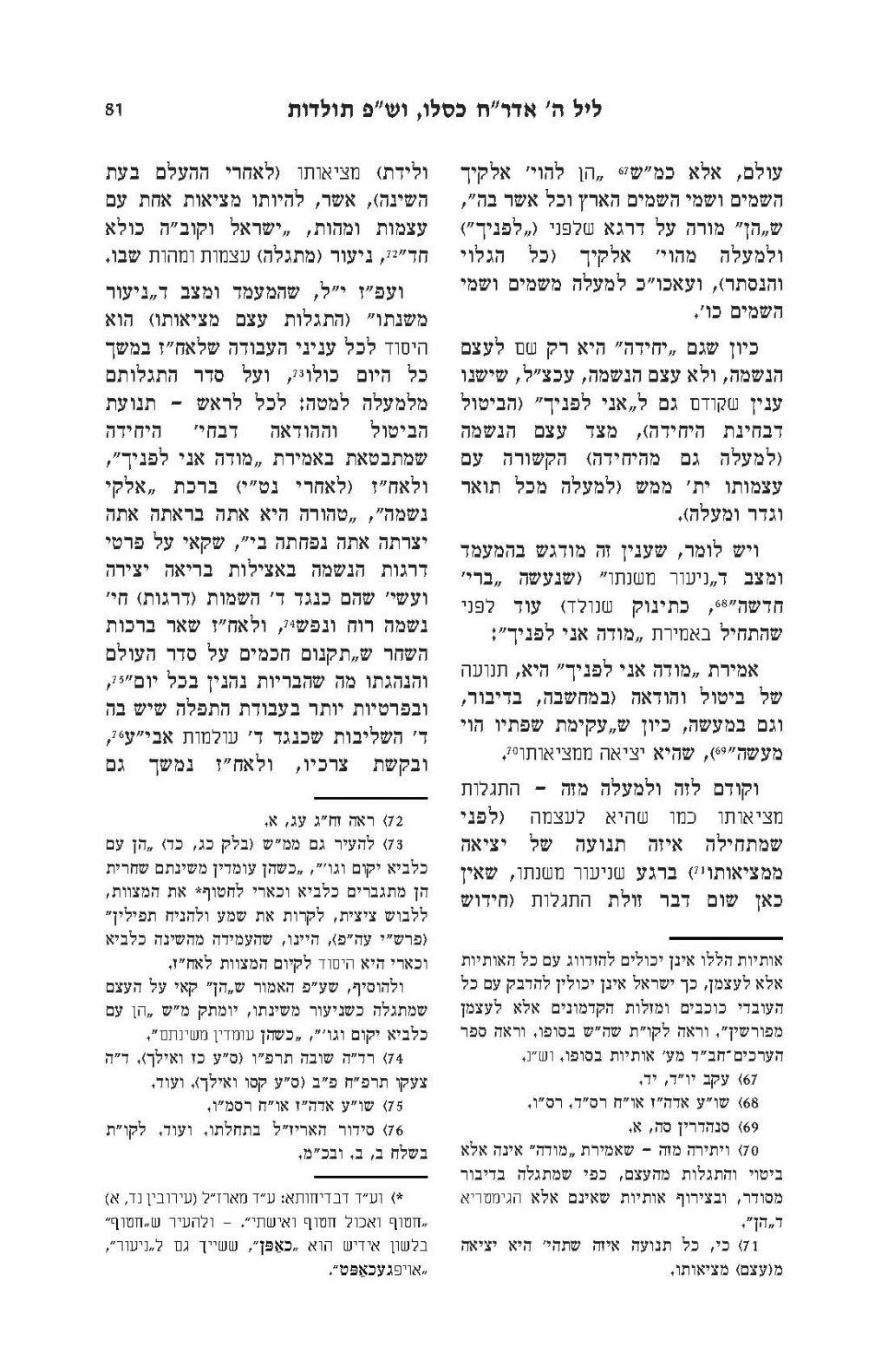 "וקודם לזה ולמעלה מזה - התגלות מציאותו כמו שהיא לעצמה לפני שמתחילה איזה תנועה של יציאה ממציאותו ברגע שניעור משנתו, שאין כאן שום דבר זולת התגלות (חידוש ולידת) מציאותו (לאחרי ההעלם בשעת השינה), אשר, להיותו מציאות אחת עם עצמות ומהות "ישראל וקוב"ה כולא חד", ניעור (מתגלה) עצמות ומהות שבו".