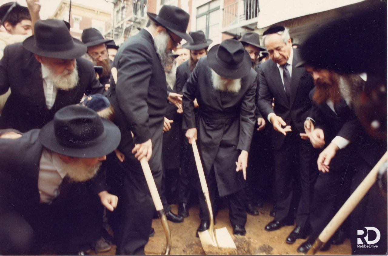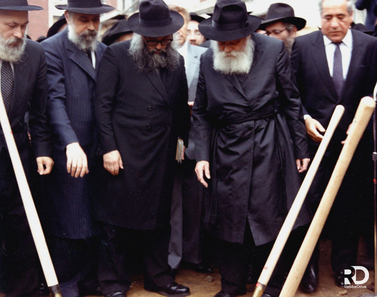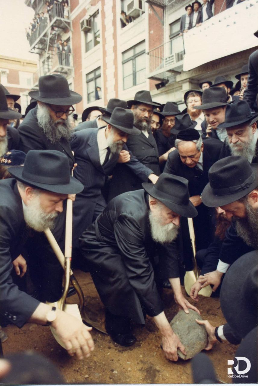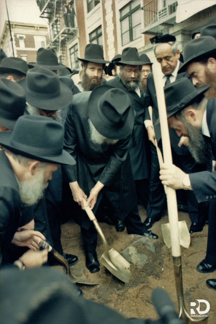 [כ"ק אדמו"ר שליט"א הגיע מביתו בשעה החמישית, לבוש בסירטוק של משי, ועלה על בימה בחצר הקדמית (ליד מקום הנחת "אבן היסוד") ואמר:] א. מאורע זה נקרא בלשון המדינה "גראונד ברייקינג", ולאחר פתיחת הקרקע טומנים בה את "אבן היסוד".